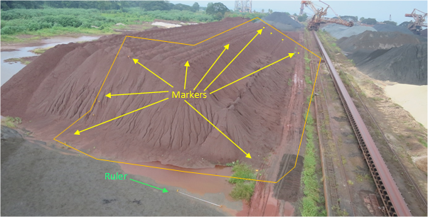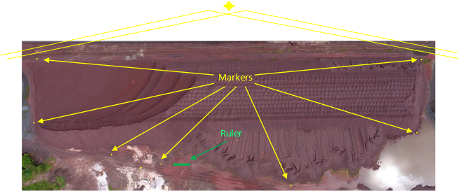 When Using DroneAfter determining the locations of the Markers, place the Markers on the Ground Level and on the Pile and ensure that the whole Pile will be properly represented and the entire Pile including Ground Level will be captured by the Camera (lens calibrated by the Software). In addition, a Calibrated Ruler/Meter Stick will be provided as a Measuring Device for the Software. When taking Picture on the entire Pile, make sure to shoot at least two (2) times varying at a certain angle in order to create a 3D image when process by the Software. (See Figure I2b.1)
